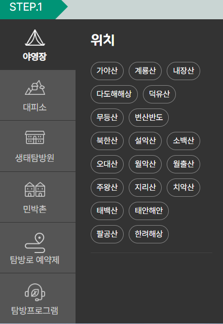 예약 가능 시설은 주로 야영장, 대피소, 탐방로입니다. 원하는 국립공원의 탐방 일정을 정하고, 해당 날짜에 예약이 가능한 시설을 확인합니다. 국립공원마다 시설의 종류나 예약 가능 여부가 다르니, 사전에 확인이 필요합니다. 위치는 아래와 같이 가야산 계룡산 내장산 태백산 지리산 설악산 등 다양한 산에 야영장을 이용할 수 있습니다.