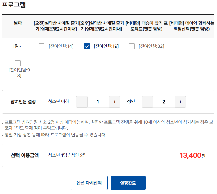 임의로 프로그램을 클릭하였는데 잔여인원수가 나오기 때문에 원하는 날짜에 인원수를 클릭하고 참여인원을 청소년과 성인 별로 설정하면 선택 이용금액이 나옵니다. 설정완료를 누르고 예약하기를 누르면 로그인 후 결제를 진행할 수 있습니다.