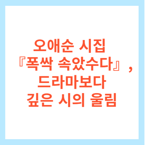 지난주, 많은 이들의 사랑을 받았던 드라마 <폭싹 속았수다>가 조용히 막을 내렸습니다. 그 여운이 너무도 길게 남아 이렇게 또 글을 쓰게 되었습니다. 특히 마지막 회에 등장한 오애순 시집 『폭싹 속았수다』는 단순한 드라마의 장치가 아닌, 인생을 시로 기록한 문학 작품으로서 진한 감동을 안겨주었습니다.
